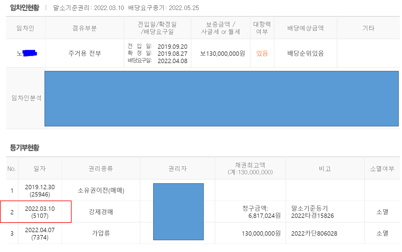 (2) 대항력이라함은 나보다  후순위 권리에 대항할 수 있는 힘을 의미한다. 따라서 선순위 권리가 있는지를 파악하는 것이 가장 중요하다.  선순위라 함은 임차인의 대항력이 발생하기 이전에 생긴 다른 권리들을 의미한다.  가장 대표적인 것이 집주인이 받은 담보대출에 의한 근저당이 있을 수 있다.