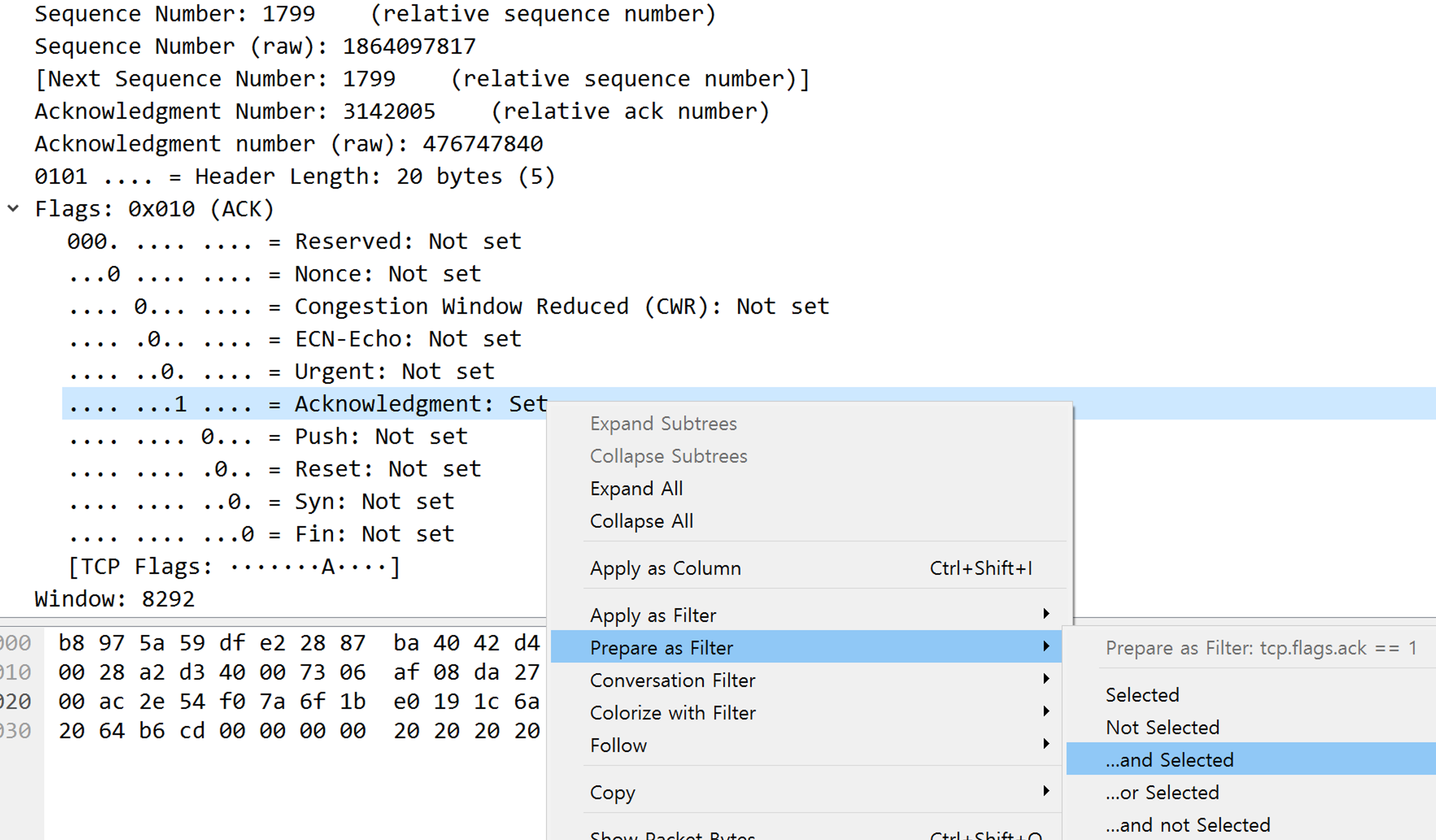 TCP 헤더 중에서 Flags 부분의 Acknowledgement 부분을 선택 후 우클릭 하여 Prepare as Filter를 선택하면 된다. 우리는 이미 TCP Source Port에 대한 필터가 있기 때문에 ... and Selected를 선택하면 된다. Or조건 이나 이번에 추가하는 내용에 Not을 붙이고 싶으면 해당 적절한 내용을 선택하면된다.