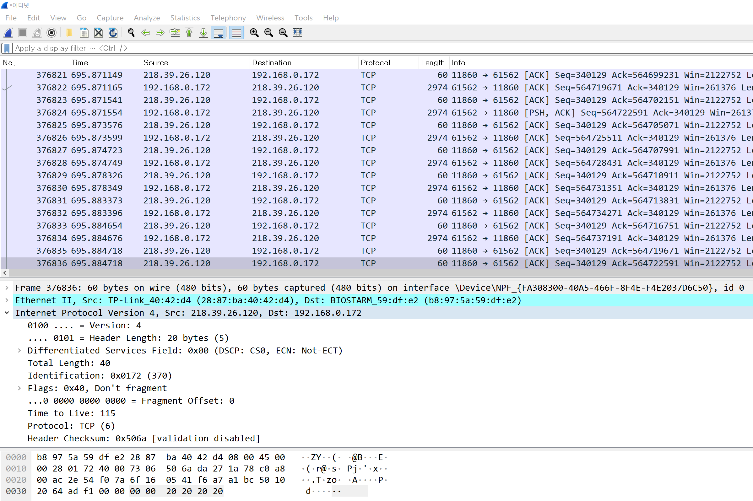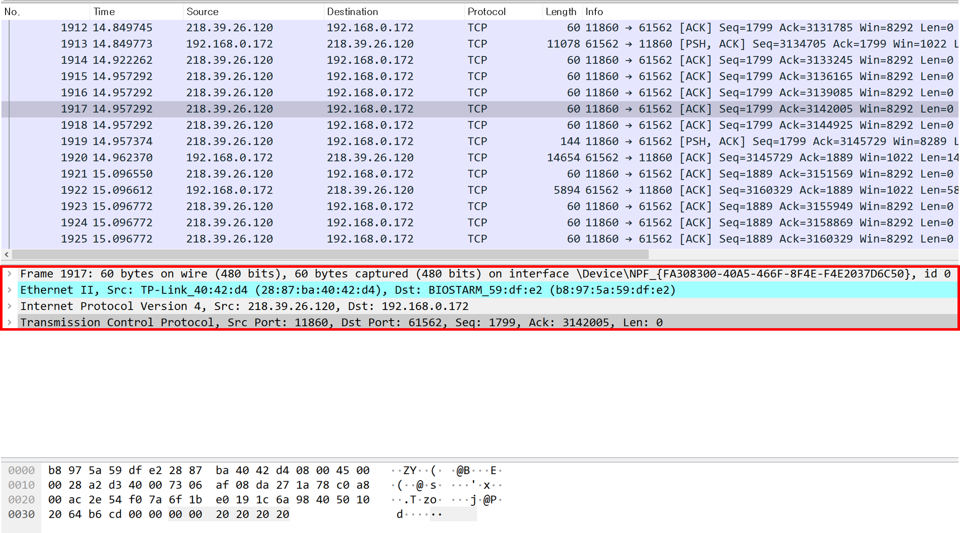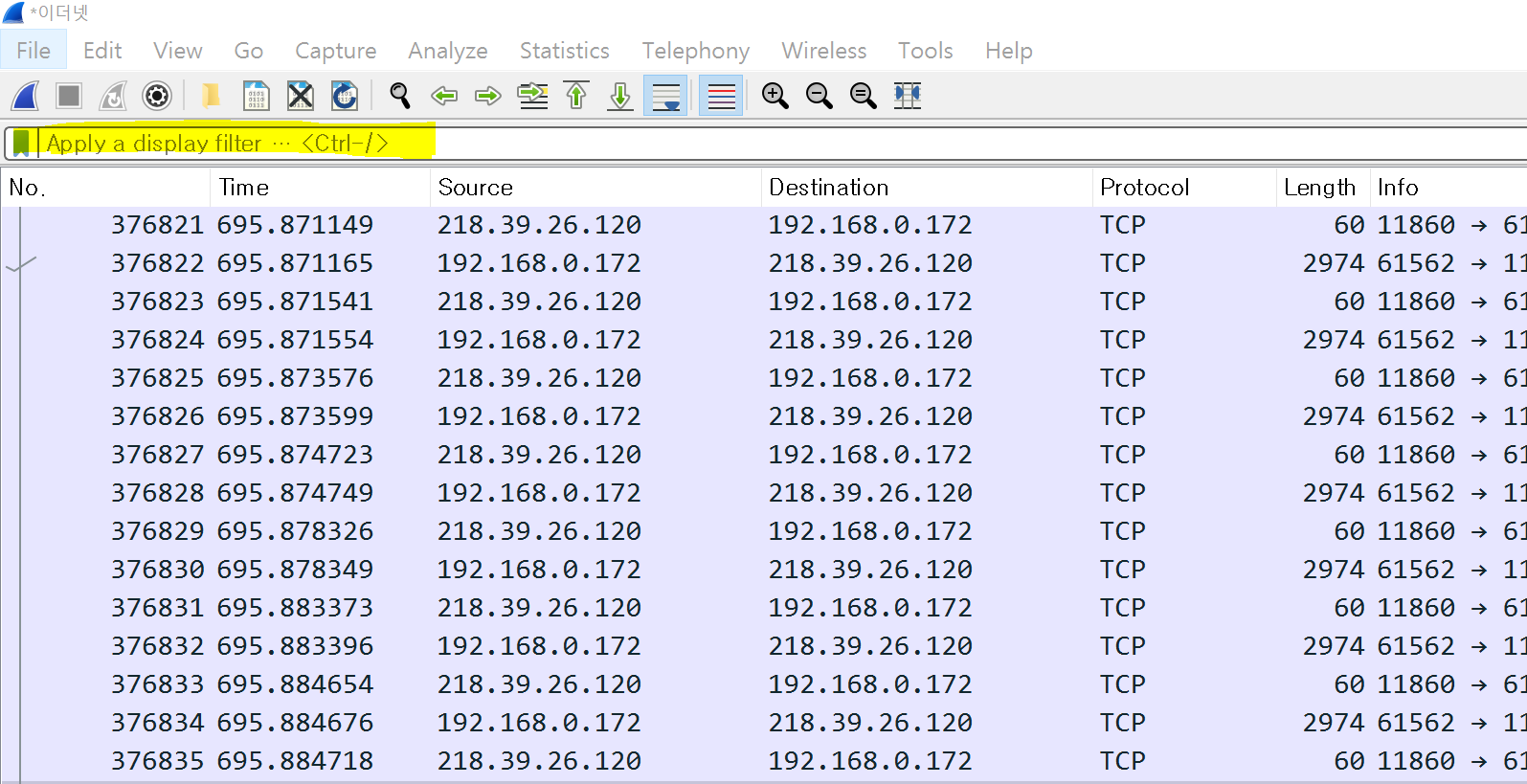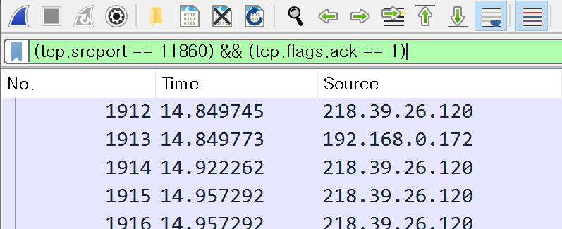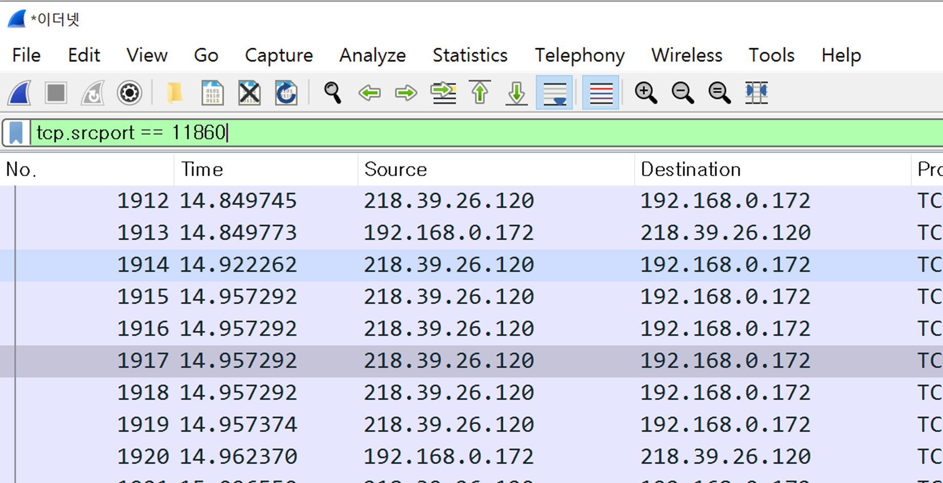 예를 들어 TCP SOURCE PORT가 11860인 패킷만 필터로 걸러내보자.