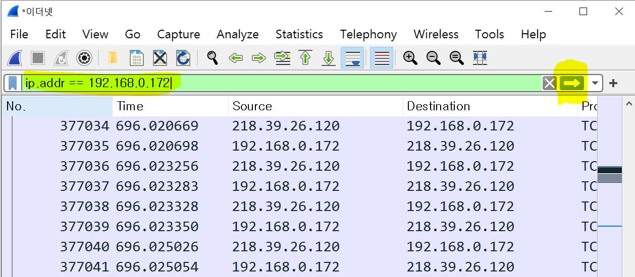본 포스트에서는 일단 디스플레이 필터 위주로 설명을 하려고 한다. 필터는 참 거짓을 판단할 수 있는 조건식으로 구성된다. 예를 들어 IP 주소가 192.168.0.172 인 패킷만 보고 싶다라고 한다면 위의 디스플레이 필터란에 다음과 같은 조건식을 작성한 후 엔터를 누르거나 우측의 화살표 버튼을 클릭하면 된다.