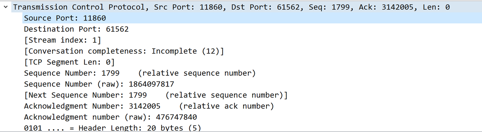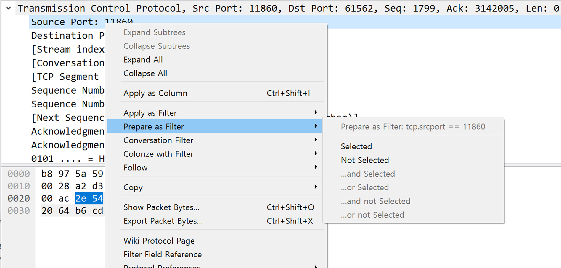 Apply as Filter를 선택 시에는 바로 해당 내용이 필터로 적용된다. Prepare as Filter는 해당 필터 구문이 Display 필터에 추가만 되고 적용은 사용자가 스스로 해야한다. 일단 Prepare as Filter를 클릭하면 우리가 원하는 조건식인 tcp.srcport == 11860이 나오게 된다. 즉 TCP SOURCE PORT에 대한 키워드를 모르는 상황에서도 이런식으로 키워드를 알아내는 것이 가능하다.