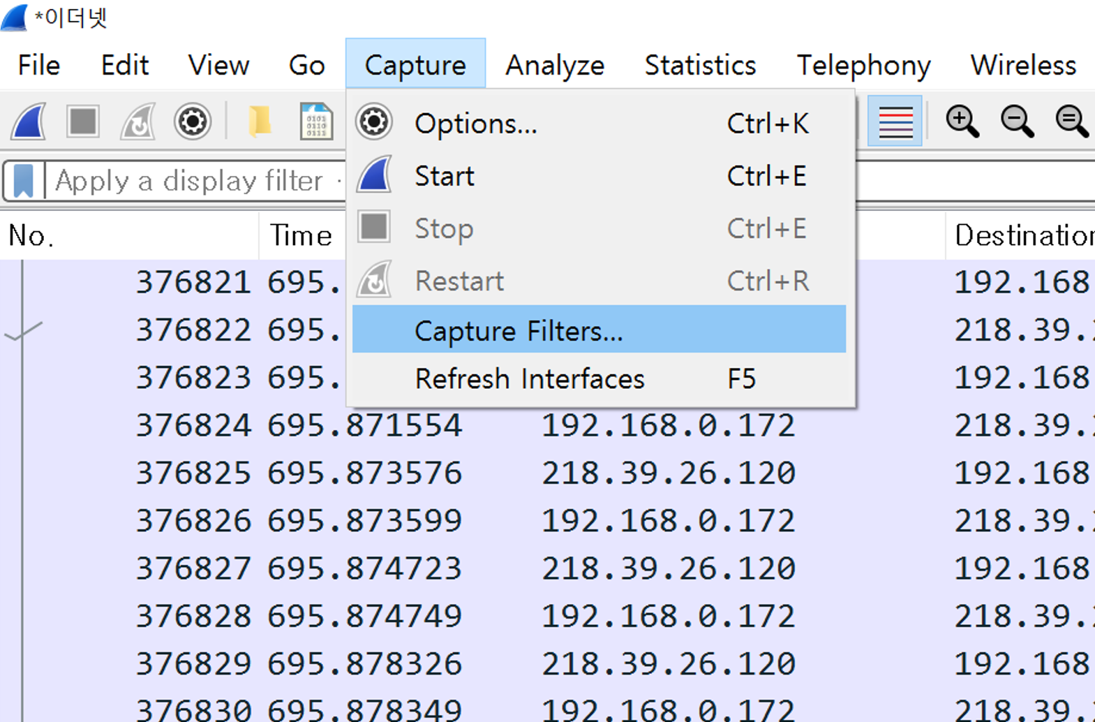 캡쳐 필터를 설정하기 위해서는 캡쳐(Capture) 메뉴에 있는 Capture Filters... 를 선택하면 된다.