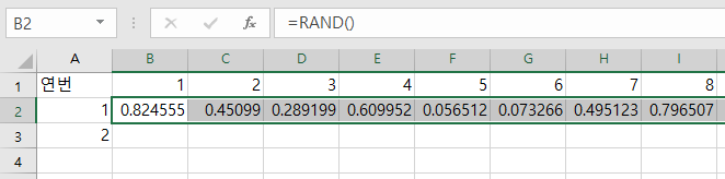 B2를 선택 후 복사(Ctrl + C)를 한다. 이후에 Ctrl + Shift + 오른쪽 방향키를 눌러서 B2:AT2의 영역을 선택한 후에 Ctrl + V를 입력하여 =RAND() 함수를 복사한다.