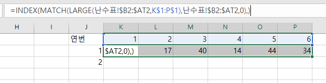 =INDEX(MATCH(LARGE(난수표!$B2:$AT2,K$1:P$1),난수표!$B2:$AT2,0),)