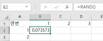 셀B2에서 =RAND()를 입력하여 첫 난수를 얻는다.
