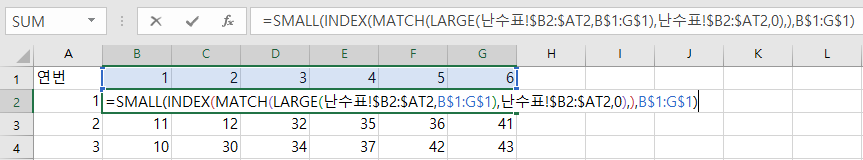 =SMALL(INDEX(MATCH(LARGE(난수표!$B2:$AT2,B$1:G$1),난수표!$B2:$AT2,0),),B$1:G$1)