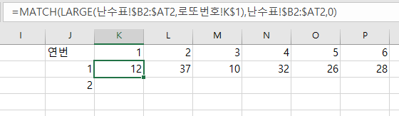 =MATCH(LARGE(난수표!$B2:$AT2,로또번호!K$1),난수표!$B2:$AT2,0)