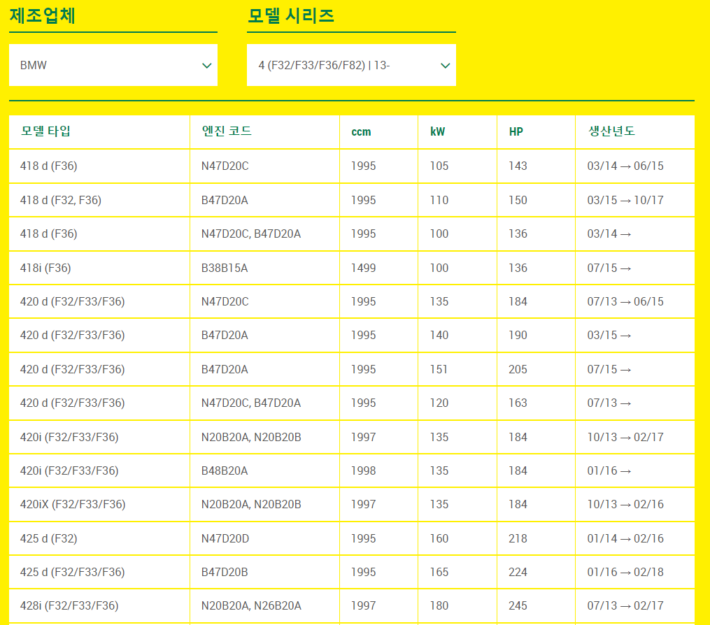 모델을 선택하면 엔진코드 별로 여러 세부 모델이 나온다. 생산년도와 엔진코드에 기반하여 자신의 차량에 맞는 제품을 선택하자.