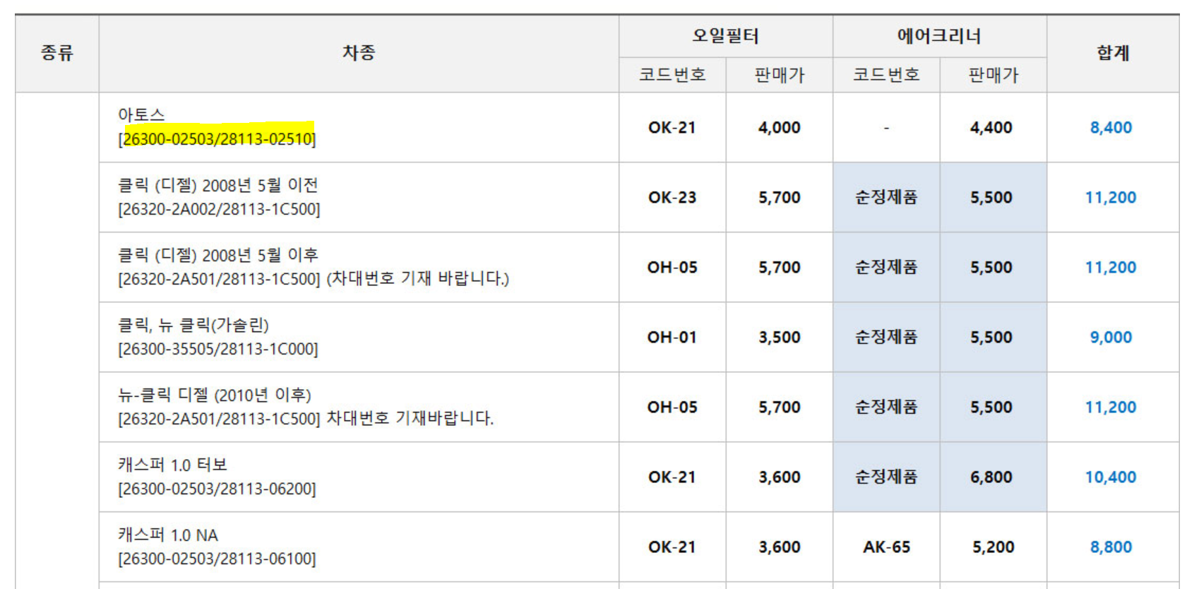 본인의 차량을 찾아서, 부품번호 확인 (오일필터/에어클리너 순)