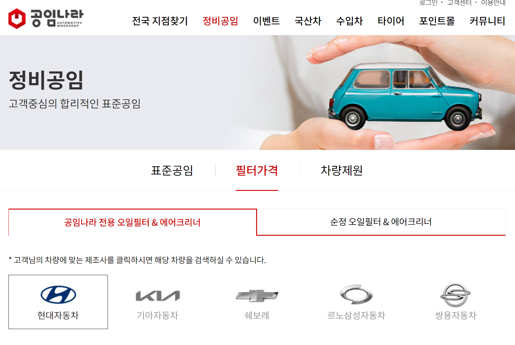 02. 공임나라 이용공임나라 접속 후에 정비공임 > 필터 가격을 선택합니다.
