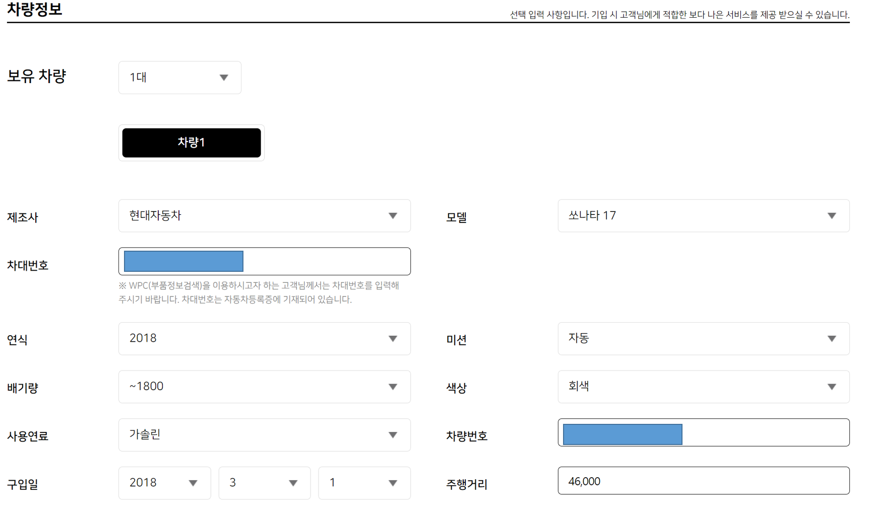 회원 가입하여 보유 차량 정보에 본인의 차량 등록