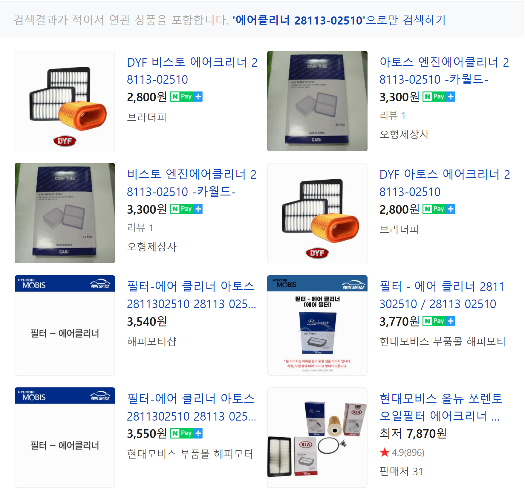 에어클리너 + 부품번호로 제품 검색 후 구매