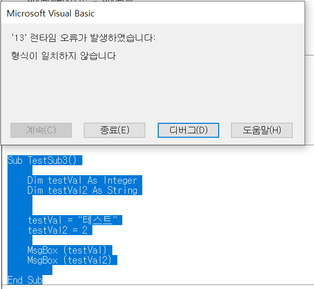 12345678910111213Sub TestSub3()Dim testVal As IntegerDim testVal2 As StringtestVal = "테스트"testVal2 = 2MsgBox (testVal)MsgBox (testVal2)End Subcs 실행하면 다음과 같은 에러가 발생하는 것을 알 수 있다.