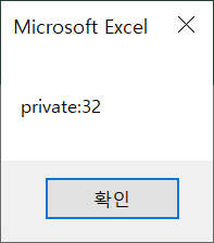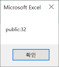- Sub 프로시저 밖에서 선언된 endRowScope1, endRowPublic, endRowPrivate에 대해서는 32라는 값이 할당된 것을 확인할 수 있다. Sub 프로시저 밖에서 선언된 변수는 같은 모듈안에 있는 Sub 프로시저 안에서 접근이 가능하다는 것을 알 수 있다.