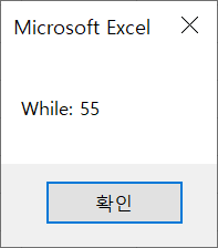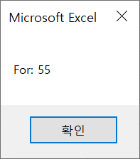 123456789101112131415161718192021222324252627Sub TestLoop()'변수 선언Dim total As IntegerDim tmp As Integertotal = 0'For..Next 문For a = 1 To 10total = total + aNext aMsgBox ("For: " & total)'While..Wend 문total = 0tmp = 1While tmp <= 10total = total + tmptmp = tmp + 1WendMsgBox ("While: " & total)'Do.. Loop 문total = 0tmp = 1Do While tmp <= 10total = total + tmptmp = tmp + 1LoopMsgBox ("Do: " & total)End Subcs 실행 결과는 다음과 같다.