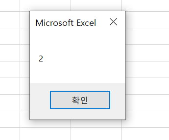 12345678910111213Sub TestSub4()Dim testVal As IntegerDim testVal2 As StringtestVal = 2testVal2 = "테스트"MsgBox (testVal)MsgBox (testVal2)End Subcs 3~4: Integer 형의 testVal 이란 변수와 String 형의 testVal2란 변수를 선언했다.