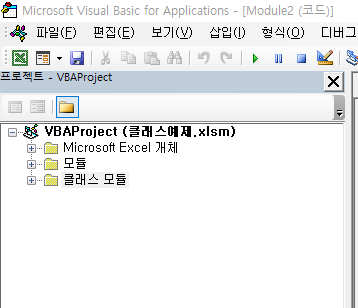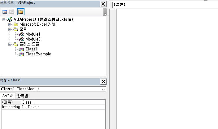 위의 절차에 따라 클래스 모듈을 추가할 수 있다. 추가 이후에는 다음과 같이 Class1이라는 클래스 모듈이 생성된다.