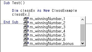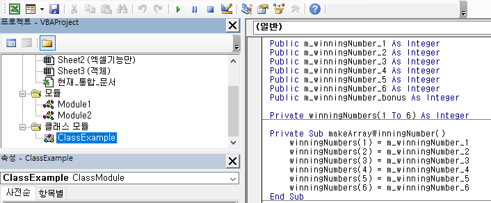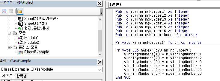 makeArrayWinningNumber 라는 이름의 Sub 프로시저를 Private 한정자를 이용하여 선언한 상태이다. 위 Sub 프로시저는winningNumbers라는 배열에 m_winningNumber1 ~ m_winnnigNumber6 까지의 숫자를 이력하는 코드가 작성되어 있다.