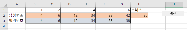 다음과 같이 시트에 당첨번호와 입력번호를 입력할 수 있는 영역을 만든다.