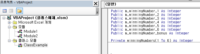 다음은 클래스 모듈의 이름을 "ClassExample"로 바꾼 상태에서 Public 한정자를 사용하여 7개의 Integer 형 변수를 선언하고 Private 한정자를 사용하여 1개의 Integer 형 배열을 선언한 예제이다.