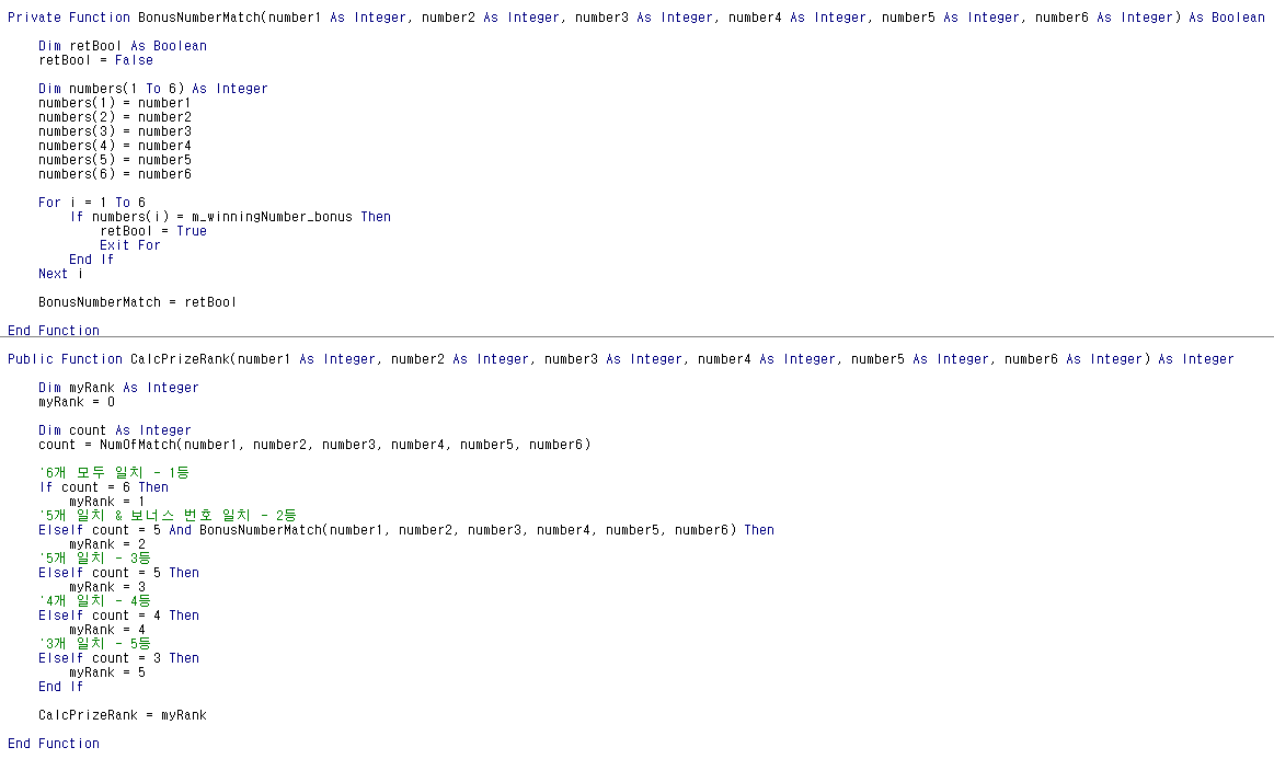 123456789101112131415161718192021222324Private Function BonusNumberMatch(number1 As Integer, number2 As Integer, number3 As Integer, number4 As Integer, number5 As Integer, number6 As Integer) As Boolean'일치할 경우 True / 일치하지 않을 경우 False 반환'반환을 위한 변수 선언Dim retBool As BooleanretBool = False'입력받은 변수를 배열로 변경Dim numbers(1 To 6) As Integernumbers(1) = number1numbers(2) = number2numbers(3) = number3numbers(4) = number4numbers(5) = number5numbers(6) = number6'배열을 순회하며 멤버변수m_winningNumber_bonus 와 비교 작업 수행, 일치할 경우 반환값에 True를 입력하고 Loop를 탈출For i = 1 To 6If numbers(i) = m_winningNumber_bonus ThenretBool = TrueExit ForEnd IfNext i'반환값 설정BonusNumberMatch = retBoolEnd Functioncs 위 함수는 입력된 6개의 숫자와 보너스 숫자와의 일치여부를 확인한다. 크래스 모듈 내부에서만 사용된다.