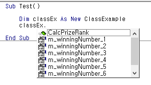 Private Function BonusNumberMatch(number1 As Integer, number2 As Integer, number3 As Integer, number4 As Integer, number5 As Integer, number6 As Integer) As Boolean Public Function CalcPrizeRank(number1 As Integer, number2 As Integer, number3 As Integer, number4 As Integer, number5 As Integer, number6 As Integer) As Integer 함수가 길지만, ClacPrizeRank 함수는 Public으로 선언되었기 때문에, 아래 그림처럼 클래스 모듈 외부에서 사용이 가능하다.