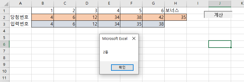 1234567891011121314151617181920212223242526272829303132333435363738394041424344454647484950515253Sub 당첨결과확인_Click()'데이터 유효성 검사 (숫자가 아닐 경우 바로 종료)For i = 2 To 7If Not IsNumeric(ActiveSheet.Cells(2, i)) ThenMsgBox ("숫자를 입력해주세요")Exit SubEnd IfIf Not IsNumeric(ActiveSheet.Cells(3, i)) ThenMsgBox ("숫자를 입력해주세요")Exit SubEnd IfNext iIf Not IsNumeric(ActiveSheet.Cells(2, 8)) ThenMsgBox ("숫자를 입력해주세요")Exit SubEnd If'클래스 모듈 선언Dim classEx As New ClassExample'클래스 모듈에 당첨번호 및 보너스 번호 입력classEx.m_winningNumber_1 = Int(ActiveSheet.Cells(2, 2))classEx.m_winningNumber_2 = Int(ActiveSheet.Cells(2, 3))classEx.m_winningNumber_3 = Int(ActiveSheet.Cells(2, 4))classEx.m_winningNumber_4 = Int(ActiveSheet.Cells(2, 5))classEx.m_winningNumber_5 = Int(ActiveSheet.Cells(2, 6))classEx.m_winningNumber_6 = Int(ActiveSheet.Cells(2, 7))classEx.m_winningNumber_bonus = Int(ActiveSheet.Cells(2, 8))'입력번호를 저장할 변수 선언 및 입력Dim myInteger1 As IntegerDim myInteger2 As IntegerDim myInteger3 As IntegerDim myInteger4 As IntegerDim myInteger5 As IntegerDim myInteger6 As IntegermyInteger1 = Int(ActiveSheet.Cells(3, 2))myInteger2 = Int(ActiveSheet.Cells(3, 3))myInteger3 = Int(ActiveSheet.Cells(3, 4))myInteger4 = Int(ActiveSheet.Cells(3, 5))myInteger5 = Int(ActiveSheet.Cells(3, 6))myInteger6 = Int(ActiveSheet.Cells(3, 7))'클래스 모듈의 ClacPrizeRank 함수를 통해 등수 계산myRank = classEx.CalcPrizeRank(myInteger1, myInteger2, myInteger3, myInteger4, myInteger5, myInteger6)' 반환값이 0인 경우 낙첨, 반환값이 0이 아닌 경우 등수를 메시지 박스에 출력If myRank = 0 ThenmyRankStr = "낙첨"ElsemyRankStr = myRank & "등"End IfMsgBox (myRankStr)End Subcs 클래스 모듈을 선언하고, 클래스 모듈의 멤버변수(당첨번호 + 보너스 숫자)를 채운 후에, 당첨 등수를 계산하는 ClacPrizeRank 함수를 호출한 결괄르 메시지 박스를 통해 보여주는 예제이다.