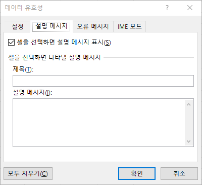 - 데이터 유효성 검사가 설정되어 있는 셀을 선택했을 때 화면에 나타나는 메시지를 설정하는 것이 가능하다.