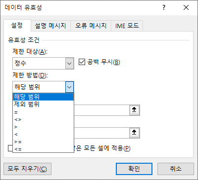 - 제한 방법은 여러가지가 있으나, 우리는 여기서 0부터 100가지의 정수인지를 확인해야 하므로 "해당 범위"를 선택한다. 참고로 엑셀에서 제한 대상이 정수일 때 제공하는 제한 방법은 아래의 그림과 같다.