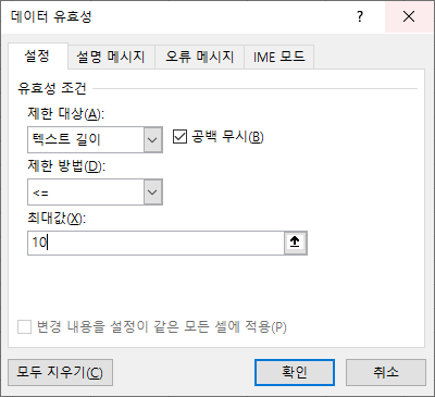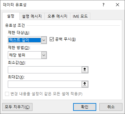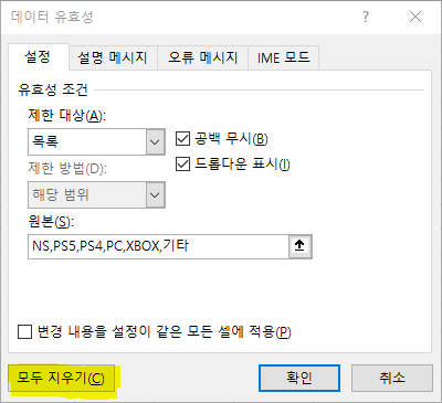 모두 지우기를 선택하면, 유효성 검사가 제거된다.