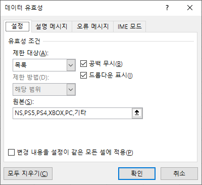 - 원본에 데이터 입력으로 허용할 목록을 콤마(,)로 구분하여 입력한다.