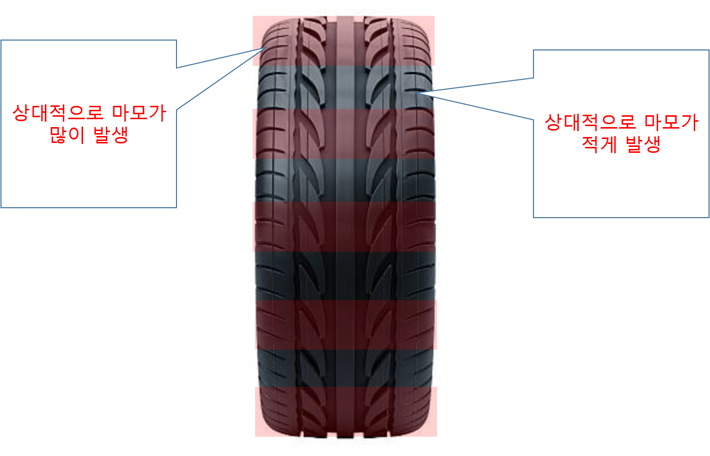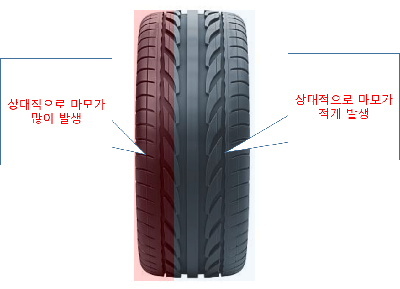편마모는 타이어의 안쪽과 바깥쪽의 마모정도가 다른 것을 의미합니다.