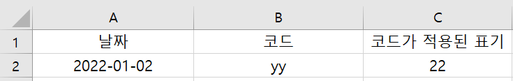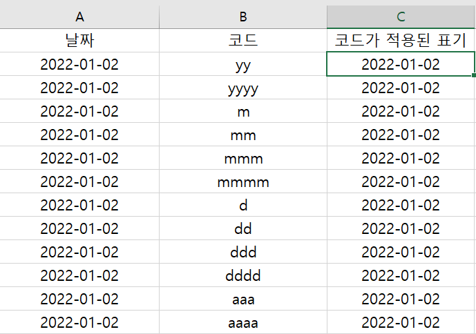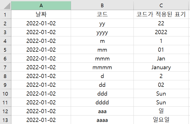 셀 서식 코드로 구성된 형식 지정 문자열을 입력할 수 있는 곳 날짜 데이터 코드 설명 연도 yy 연도를 두자리로 표시, 2000 -> 00 yyyy 연도를 네자리로 표시, 2000 -> 2000 월 m 월을 한자리로 표시, 5월 -> 5 mm 월을 두자리로 표시, 5월 -> 05 mmm 월을 영어(세글자로 표현), 1월 -> Jan mmmm 월을 영어로 표시, 1월 -> January mmmmm 월을 영어 첫 대문자만 표시, 1월 -> J 일 d 일을 한자리로 표시, 5일 -> 5 dd 일을 두자리로 표시, 5일 -> 05 요일 ddd 요일을 영어 약자로 표시 dddd 요일을 영어로 표시 aaa 요일을 한글 약자로 표시 aaaa 요일을 한글로 표시 02. 서식 코드 조합 예제서식 코드를 조합해서 날짜를 표기할 때 주의할 점은 셀에 있는 값이 엑셀이 날짜로 인식할 수 있는 값이어야 한다는 점이다. 엑셀에서 셀에 날짜를 입력하는 방법에 대해서는 다음 포스트를 참고하기 바란다.