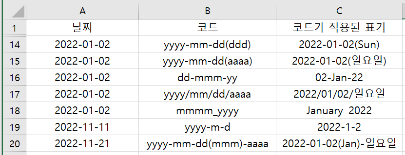 우클릭>셀서식>표시형식>사용자 지정>형식에 B열에 있는 코드를 입력하여 날짜 표기가 어떤식으로 변경되는지 확인해보자.