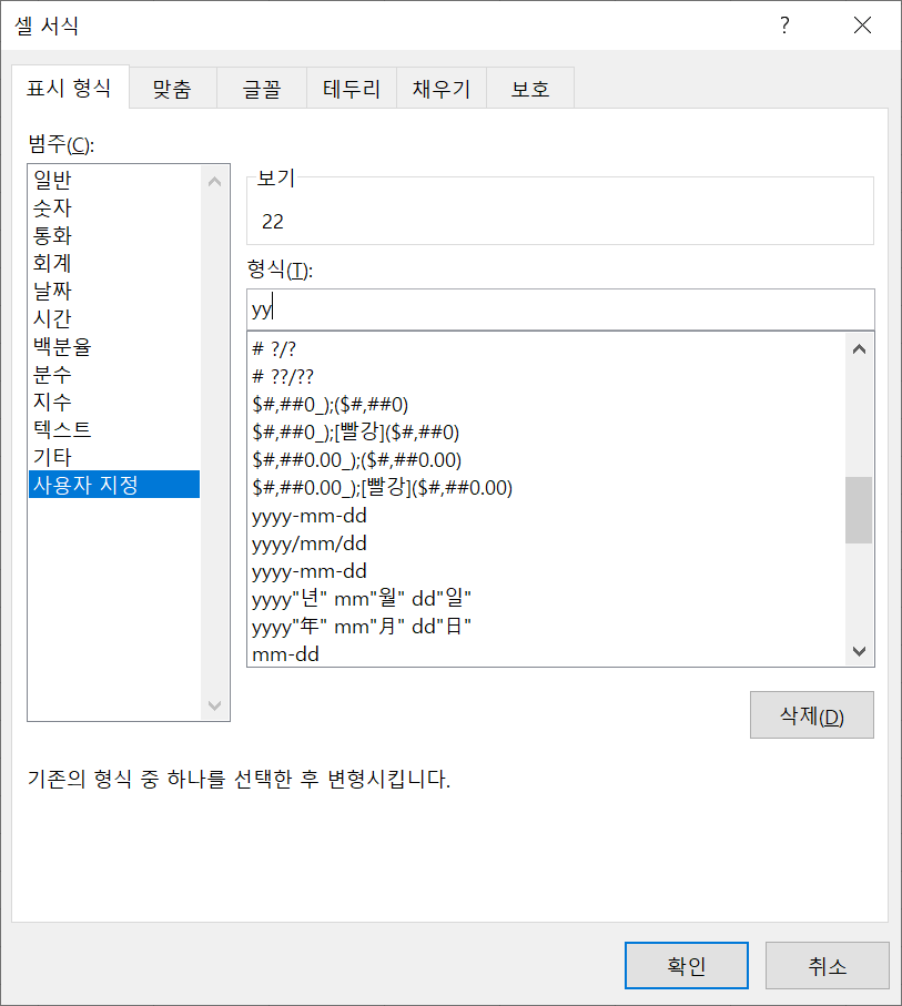 위의 그림은 형식 부분에 yy를 입력한 것이다.