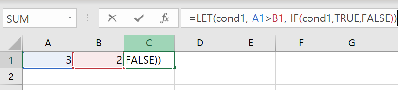 A1>B1이라는 수식을 cond1이라고 지칭하기로 했고, LET 함수의 세번째 인자인 계산식에서