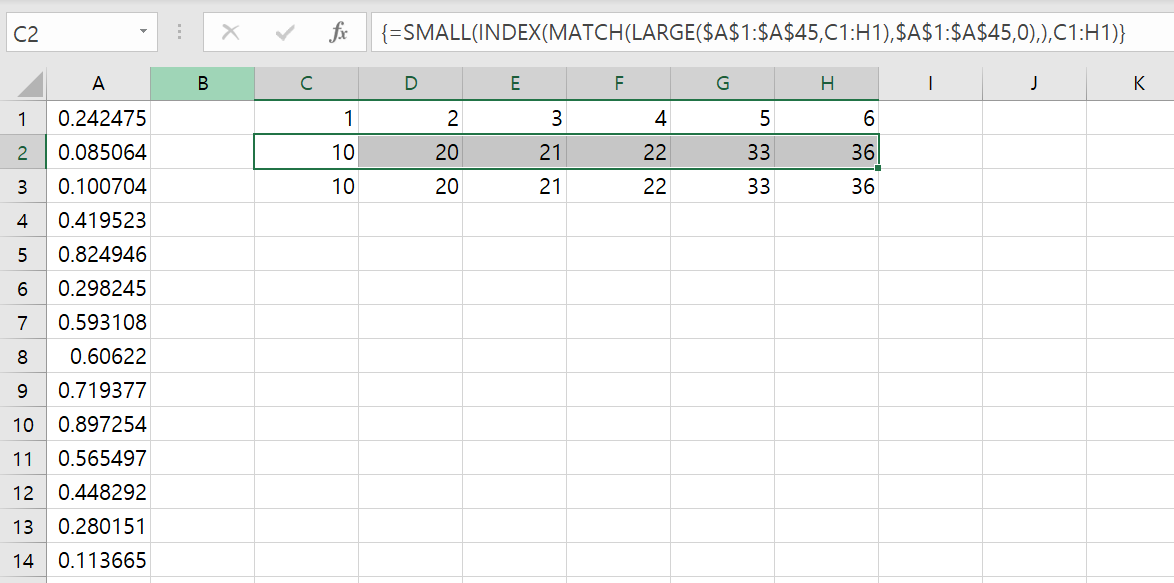 =LET(rg_1,$A$1:$A$45,rg_2,C1:H1,SMALL(INDEX(MATCH(LARGE(rg_1,rg_2),rg_1,0),),rg_2))