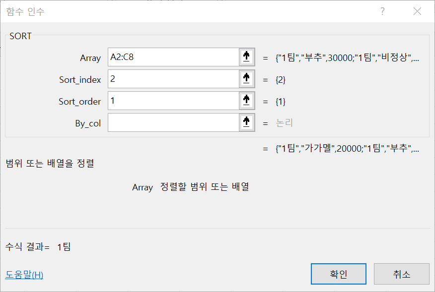 SORT 함수의 인자는 다음과 같다.