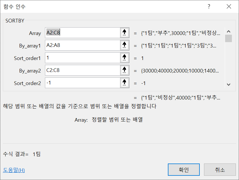- By_array1: 정렬할 기준이 되는 열 또는 행의 영역 또는 배열 (기준1)
