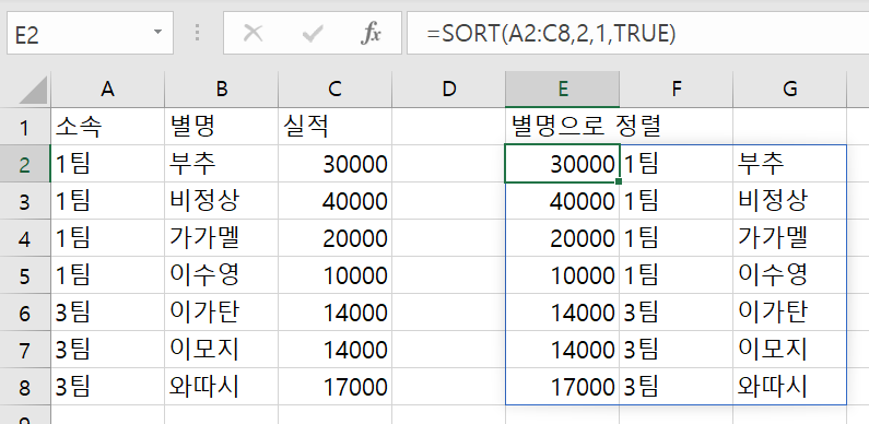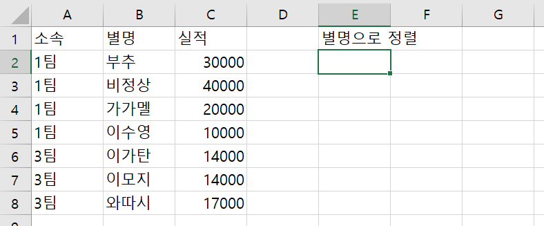 별명을 기준으로 위의 데이터(A2:C8)를 오름차순으로 정렬하여 E2부터 나타내보자.
