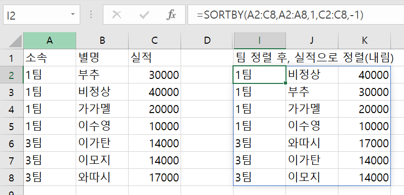 외쪽의 데이터(A2:C8)를 소속을 기준으로 오름차순으로 정렬 후, 팀내에서 실적을 기준으로 내림차순으로 정렬해보자.
